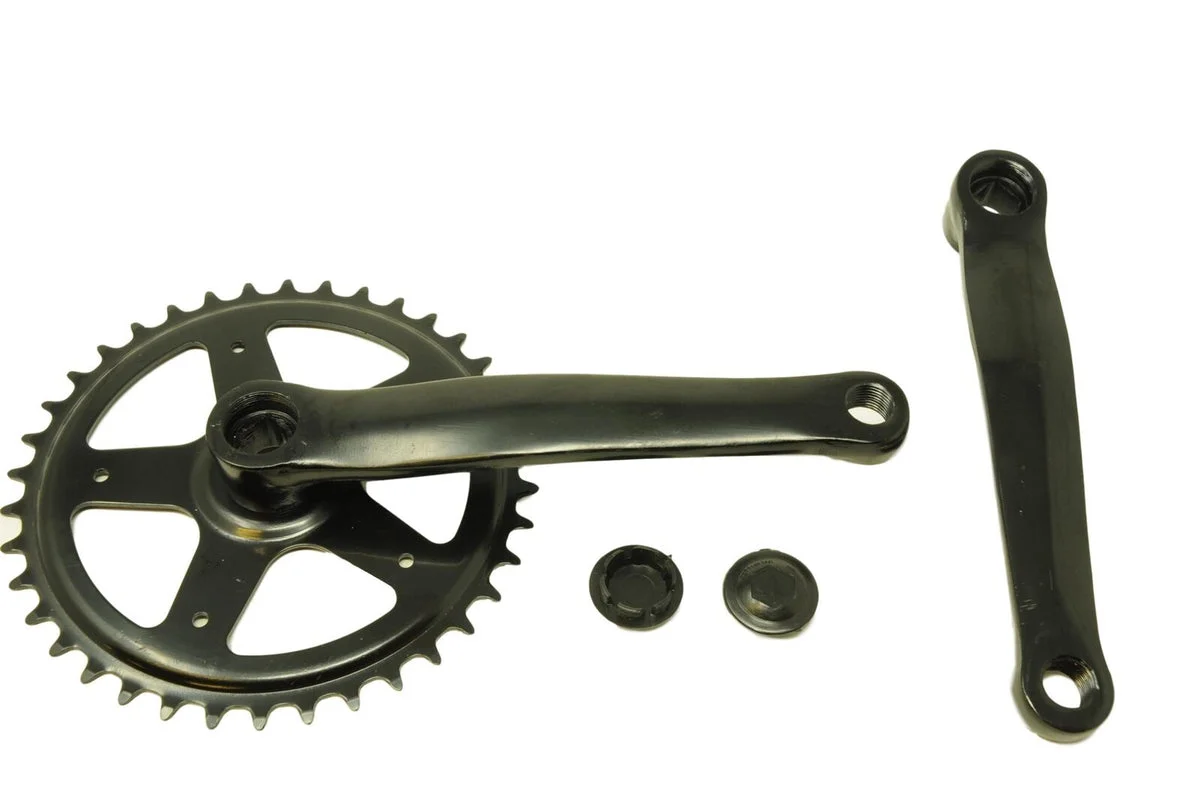 38 TEETH SINGLE CHAINWHEEL WITH COTTERLESS SQUARE TAPER CRANKSTHIS CHAINWHEEL SET HAS A 170mm LONG PEDAL ARM SO SUITABLE FOR ADULT BIKESGOOD FOR HUB GEAR BIKES AND SINGLE SPEED38 TEETH STEEL CHAINWHEEL MADE FOR A 1/8 WIDTH CHAIN AS USED ON SINGLE SPEED OR HUB GEAR BIKESBLACK PAINTED FINISH CHAINRING119-122AXLE REQUIREDWEIGHT 980grams (approx)
