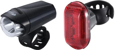 BBB’s Ecobeam front light has 1 LED with 2 modes (continuous and flashing) and a water-resistant housing. A silicone strap allows easy mounting. The Redlaser rear light features 3 bright LED micro-LEDs, a waterproof housing and 2 modes (continuous and flashing). A silicone strap allows easy mounting..Mounting: StrapMount.Alkaline Batteries included.Battery life: 230 h (max)Ecobeam Front Light.1 x LED, 39 Lumens.2 Modes -Continuous, flashing.Battery type: Front: AAA x3.Mounting: Silicone StrapMount.Water resistant housing.Weight: 74g.Colour: Black.Dimensions: 83 x 38 x 37 mmRedlaser Rear Light.3 x Bright micro-LEDs, 7 Lumens.2 Modes – Continuous, flashing.Mounting: Silicone StrapMount.Waterproof housing.Weight: 56g.Colour: Black.Dimensions: 65 x 38 x26 mm