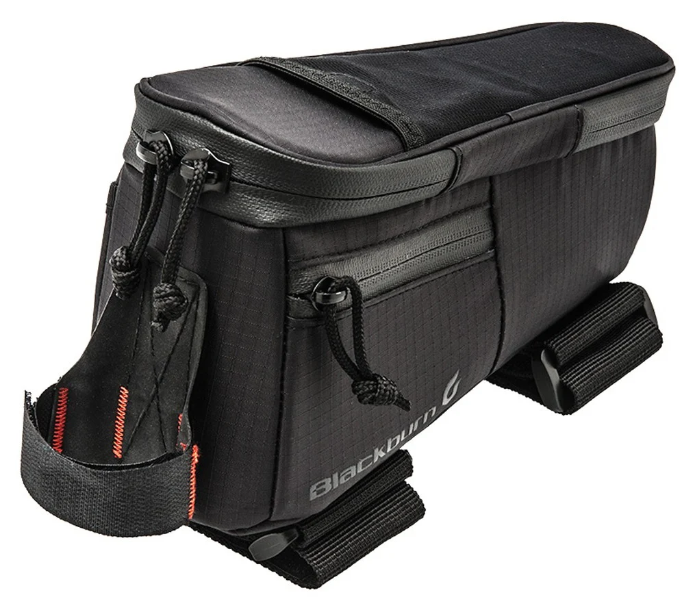 Blackburn: Easy access to your essential riding gear. A high-end top tube bag thatworks great for the expedition cyclist, but also serves the needs of a longweekend ride or event.• Spacious interior with adjustable organizer• Exterior mesh pocket for phone or camera• Zippered I.D. and cash pocket• Top tube straps adjust to mount quickly on almost any bike• 70D nylon, 4mm ripstop with water resistant treatment and backing