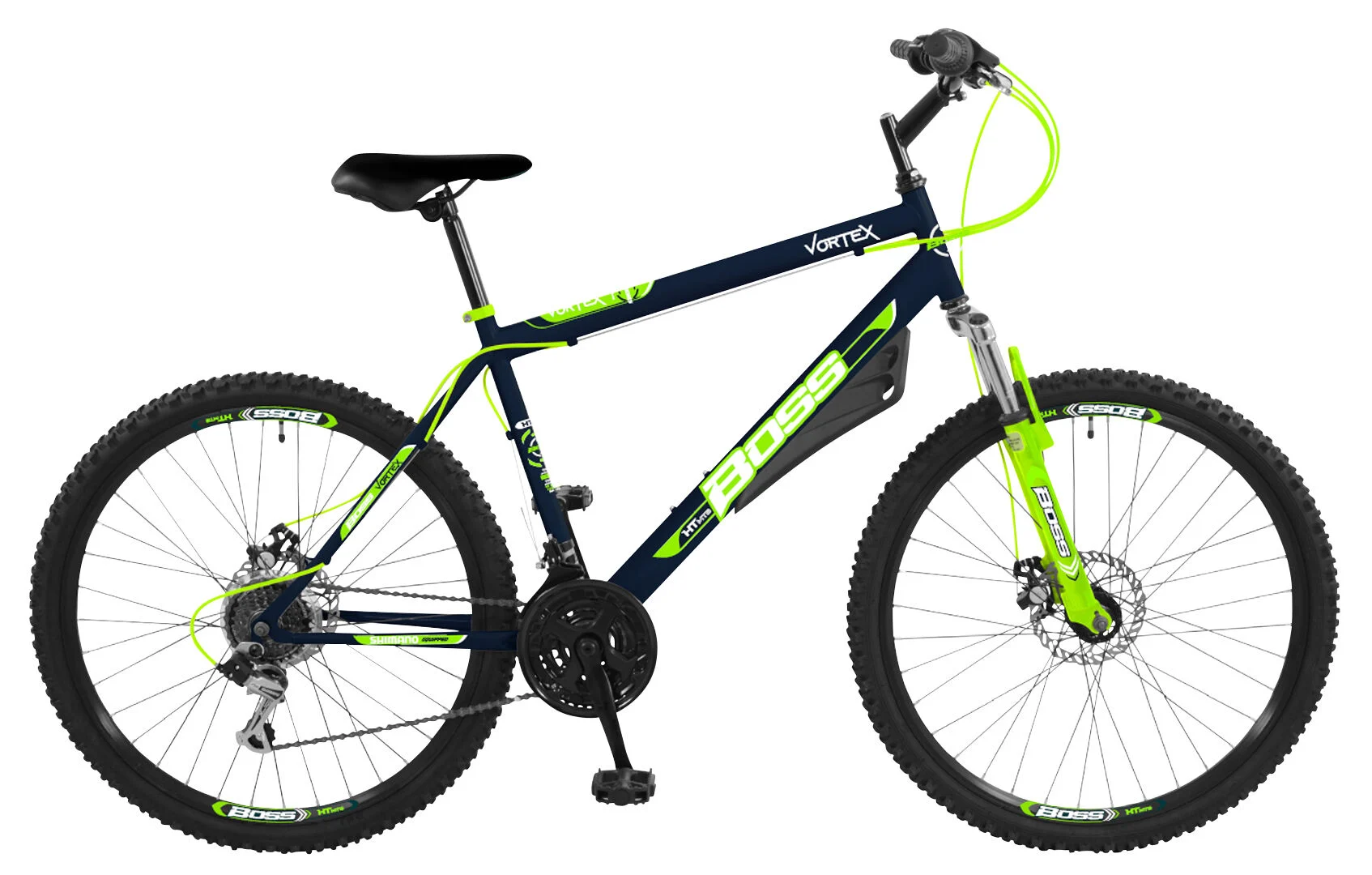The Boss Vortex 26 inch mountain bike is set to tackle the elements and stand out from the crowd. The Vortex has a strong hi-tensile steel frame and Zoom branded front suspension fork to provide a responsive ride and take the bumps out of the terrain. Control is further enhanced courtesy of the front and rear Zoom branded mechanical disc brakes. The 3-finger alloy levers respond well to the touch for re-assuring feedback, whilst 160 mm wavy rotors disperse heat to extended the braking performance. 18 speed Shimano gearing is controlled by Shimano Revoshift shifters, for a natural and seamless gear change. 2.1″ wide sure-grip knobbly mountain bike tyres keep you moving in the right direction and are supported by lightweight and robust, double wall rims to provide a strong base for your ride. Style is an abundance, thanks to the matt grey frame and oversized rim graphics, for a truly premium look. The MTB saddle is fitted with rail adjusters to allow front to back adjustment and a long 300 mm seat post with alloy clamp provides bags of height adjustment for the best possible fit. To complete the line-up, a sleek frame mounted front mud-guard catches the crud thrown up whilst out on your ride and adds a cool aggressive edge to the design. If you are looking for an eye-catching bike with the spec to impress, then the Boss Vortex is the bike for you. Suitable for inside leg measurement of 71cm – 87cm / 28-34″