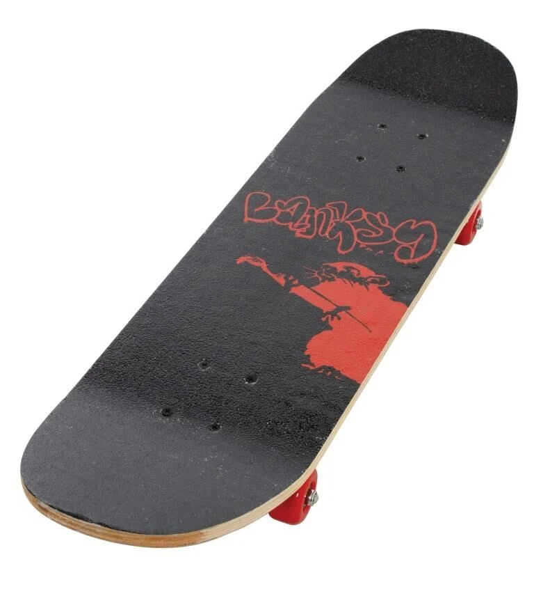 This entry level skateboard is perfect for beginner and novice riders looking to perfect riding technique and basic tricks. The layered 7-ply deck is extremely stable and durable and boasts ultra stylised Banksy design graphics both to the underside and the printed griptape. This super Urban design is perfect for the streets and skate park! The flat surface of the deck is ideal for beginners as it allows for maximum foot spacing so that riders can master the balance and coordination required to progress to tricks. Speaking of tricks, the double kicktail deck and large flat surface area are just what’s needed to master ‘boardwalking’ and ‘Ollie’s’ which are core tricks required for progression! The durable plastic trucks can be adjusted for customised riding styles as well as for specific settings for tricks to ensure elimination of ‘wheel bite.’ The 50mm PVC wheels have a rounded profile offering a smaller surface patch which allows for greater speed whilst the 608z bearings ensure comfort and a smoother movement.