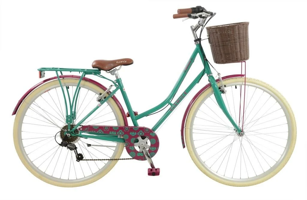 The timeless Deluxe heritage bike from Elswick has been designed with a beautiful 17″ easy step-through frame giving it a leisurely yet responsive ride. The Deluxe features easy to use, reliable 6 speed gearing that is operated via a twist grip shifter. The wicker effect basket is durable and waterproof (unlike wood based alternatives) and is ideal for transporting shopping (or pets!) and adds a sense of continental class. The frame is finished in striking dark green with contrasting fuschia finished front and rear full-length metal mudguards, as well as the matching full length chain guard providing protection from the chain. The 700C smooth-rolling cream coloured tyres complement the satin alloy wheel rims & chrome seat-post,handlebar and stem. Reliable braking is provided courtesy of the front and rear aluminium V-brakes which supply controlled braking power through the reach-adjustable brake levers. As we know comfort is important to you, a wide Elswick leather effect comfort saddle is supplied as standard with complementing ergonomic soft-touch grips. The Elswick Deluxe is a beautiful bike, with it’s own sense of personality and style, putting a fresh look to this timeless bike style. The charm of Elswick shines through by mixing old with new, to create a great bike to be seen around town on. Upgrades over the Elswick Royal if you hadn’t spotted them are the 6 speed gears, and front basket. Suitable for cyclists with an approximate inside leg measurement of 68-85 cms/27-33″.