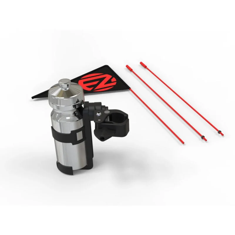 If you want to keep cruising with your EzyRoller, you will need at least some water! So the team at EzyRoller has come out with this bottle holder that will attach to the side of your EzyRoller seat! It also contains a flag so you are able to play team matches with your friends! Made of steel, plastic and fabric. Bottle not included!