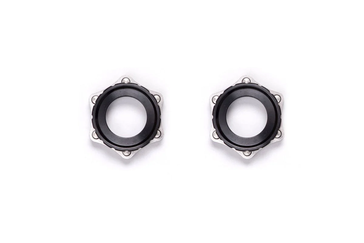 A pair of HUNT 6-Bolt Rotor adapters that can be used to fit a 6-bolt brake rotor to the centre-lock spline used on HUNT disc hubs.