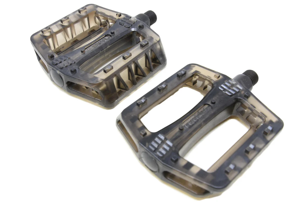 - THESE LIGHTWEIGHT PEDALS ARE MADE FROM A STRONG, HIGH IMPACT POLYCARBONATE, WHICH IS A VERY DURABLE MATERIAL. THE PEDAL PLATFORM IS NARROW IN DEPTH, WHICH HOUSES A HARDENED 4130 CHROMOLY SPINDLE FOR EXTRA STRENGTH