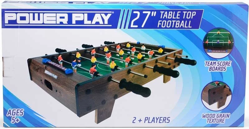 Whether you prefer playing quick tiki taka passing football or would rather get it in the mixer as soon as possible, one thing every player can agree on is a good pitch. Whatever your style, the Power Play table top football game can be your theatre of dreams. With a sturdy and well thought out design you can expect to have hours of fun without any wear and tear. This table looks as good as it plays with a stylish wood grain effect finish ensuring it stands out from your standard table top game. It even has leg stands for extra stability and elevation! Power Play provides the ultimate in table top football. With 18 players and a ball included you’re good to go for a competitive game of 9 a side, whether you choose to play one on one or two on two. It even has two score sliders so you can keep track as the goals fly in. For action packed family fun or to liven up a night in with friends look no further than the 27″ Power Play table football table. All of the fun and feel of a real football table without the hassle!