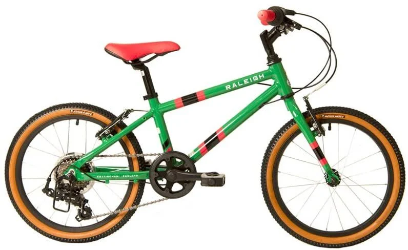 Fun and sophisticated. The Pop 18 bridges the gap between younger and older childs bikes. The green frame pops with red and black stripes and pairs this perfectly with mature black tanwall tyres.