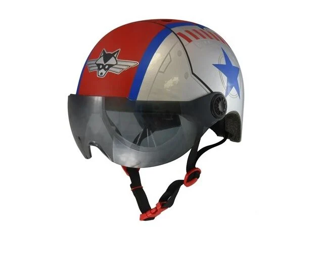 The Raskullz Flying Ace Fit System helmet is outta control. This helmet features a shield that can be worn up or down and has a sleek, easy-to-use fit system that offers an adjustable, secure fit with a quick turn of the dial, and amazing fighter jet pilot graphics. Ride through blue skies on a bike, scooter or skateboard with the Raskullz Flying Ace Shield helmet! The child size helmet is recommended for riders 5-8 years old, but will fit anyone with a head measuring 50-54 cm.