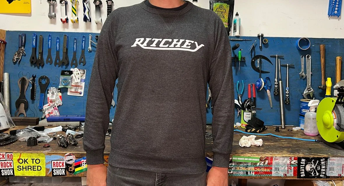 Be part of the Ritchey Crew with the Ritchey Crew sweater! Made of 7oz French Terry fabric that is tightly knit for durable softness, this unisex top features a V-gusset on the neck, raglan sleeves and 2×1 ribbed collar, cuffs and waistband for a classic and flattering fit. The Ritchey Crew is handprinted in San Francisco with the Ritchey logo, and it’s nice and simple pullover for off-the-bike casual lounging or on-bike practical pursuits