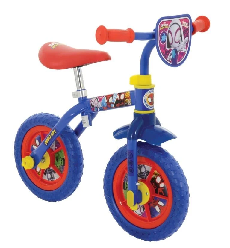 Let’s Hero Up! The perfect first bike for any budding superhero! The Spidey and his Amazing Friends 2 in 1 Training bike comes with 4 character plaques which are easily interchangeable for a different adventure every day! With colourful character graphics, the 2-in-1 converts easily from a training to a balance bike in a matter of minutes. Stage one is the pedal bike where riders can get used to pedalling and steering with the aid of rear stabilisers. Stage two is the balance bike mode where pedals and stabilisers are removed as core coordination, strength and skill improve to allow ‘push off’ and balance via freewheeling. The wide EVA moulded wheels with mag wheel inner provide extra stability and the deep tread tyres offer a strong yet comfortable ride with excellent grip. Both saddle and handlebars are adjustable in height to suit children as they grow and gain in confidence and a soft saddle and hand grips provide additional comfort whilst learning.